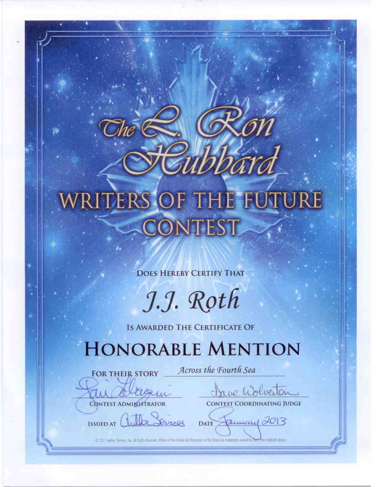 I haven’t been identifying my honorable mentions and semi-finalists in the Writers of the Future Contest by name in case a potential publisher is evaluating one of my submissions and visits my site. I don’t know whether a given publisher will consider a contest shortlisting a good thing or a bad thing.  In the “literary fiction” arena, from whence I hail, shortlistings are generally a good thing.  But I’m still learning the mores of genre submitting, and to make things more complicated, there seems to be conflicting information on just about everything having to do with submitting to genre publications.  As a lawyer, I’ve learned the value of keeping one’s mouth shut when in doubt and it seems silly to take the risk of prejudicing a decision, so I’ve kept mum on the subject.